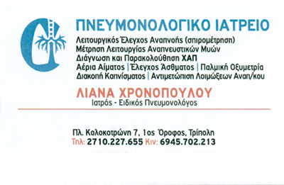 customer tabsΕπικοινωνίαΕργαστηριακός Πνευμονολόγικός ΈλεγχοςΛειτουργικός έλεγχος Αναπνοής (Σπιρομέτρηση),Χαπ, Διακοπή ΚαπνίσματοςΔέχεται καθημερινά 9-11 , Δευτέρα-Τρίτη-Πέμπτη 18:00-20:00Πνευμονολόγοι - ΦυματιολόγοιΥγείαΠλατεία Κολοκοτρώνη 7, Τρίπολη, ΑρκαδίαΤΡΙΠΟΛΗ ΑΡΚΑΔΙΑΣΑΡΚΑΔΙΑΠΕΛΟΠΟΝΝΗΣΟΣ 2710227655 69457022132710227655xronopoulou_liana@yahoo.gr Το προτείνω (έχει προταθεί 0 φορές) ΦωτογραφίεςFacebook LikeShare on FacebookTweet Widget